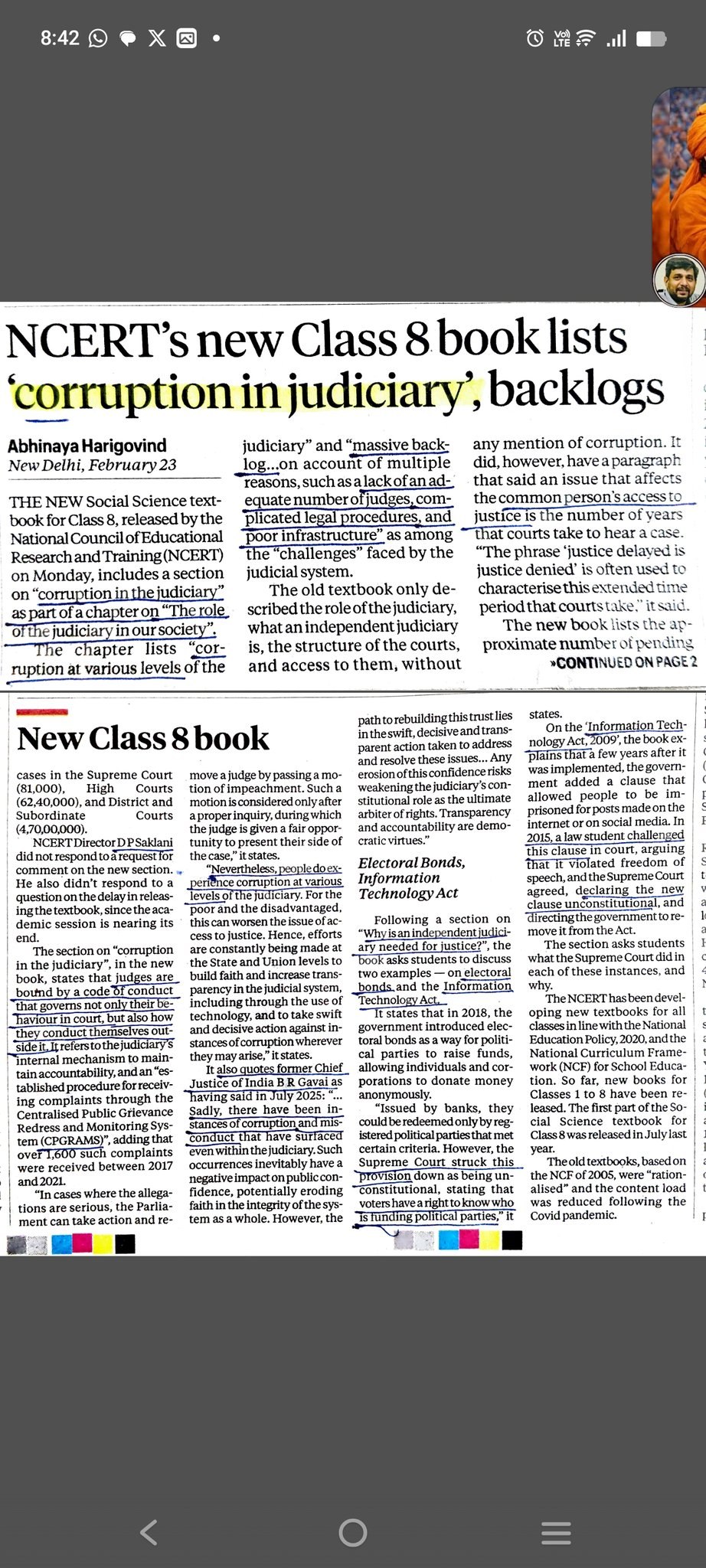 आठवीं कक्षा की इस नई किताब में “न्यायपालिका में भ्रष्टाचार”का दावा किया गया है। न्यायमूर्ति जोमालिया बागची ने इसे खुद संविधान के बुनियादी ढांचे पर हमला बताया। उन्होंने कहा कि “यह किताब खुद बुनियादी ढांचे के खिलाफ है।”