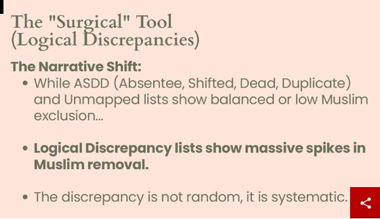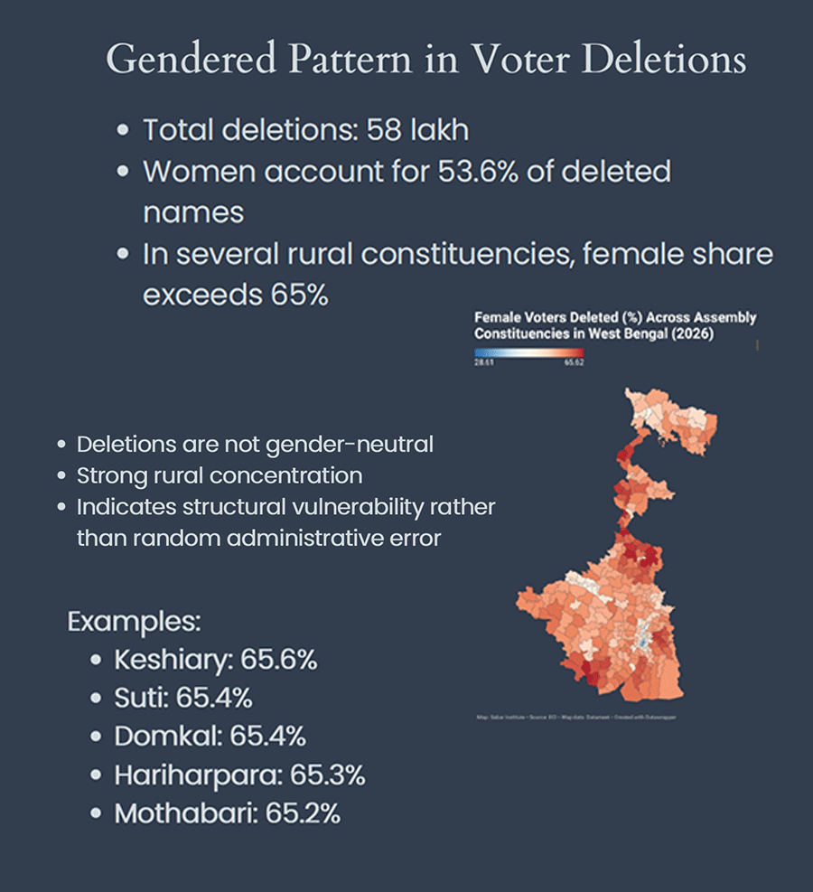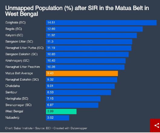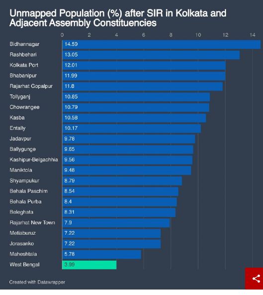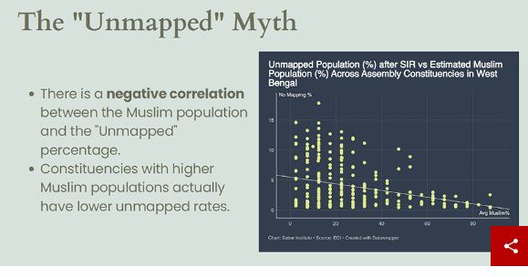 सोमवार को नई दिल्ली में आयोजित एक कार्यक्रम में प्रस्तुत आंकड़ों के अनुसार, पश्चिम बंगाल में चल रहे मतदाता सूची के ‘विशेष गहन पुनरीक्षण’ (SIR) के दौरान बड़ी संख्या में मुस्लिम मतदाताओं को कथित “तार्किक विसंगतियों” (logical discrepancies) के आधार पर चिन्हित किया गया है। इसके अतिरिक्त, कई क्षेत्रों में हटाए गए नामों में आधे से अधिक संख्या महिलाओं की बताई जा रही है।