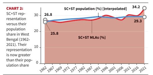 पश्चिम बंगाल की विधायिका अनुसूचित जातियों (SCs) और अनुसूचित जनजातियों (STs) का बेहतर प्रतिनिधित्व करती है। विधानसभा में उनका प्रतिनिधित्व अब उनकी आबादी के अनुपात के बराबर या उससे भी अधिक है। 2021 में, SC और ST विधायकों का अनुपात 34.2% था, जो उनकी 29.3% की आबादी से अधिक है।